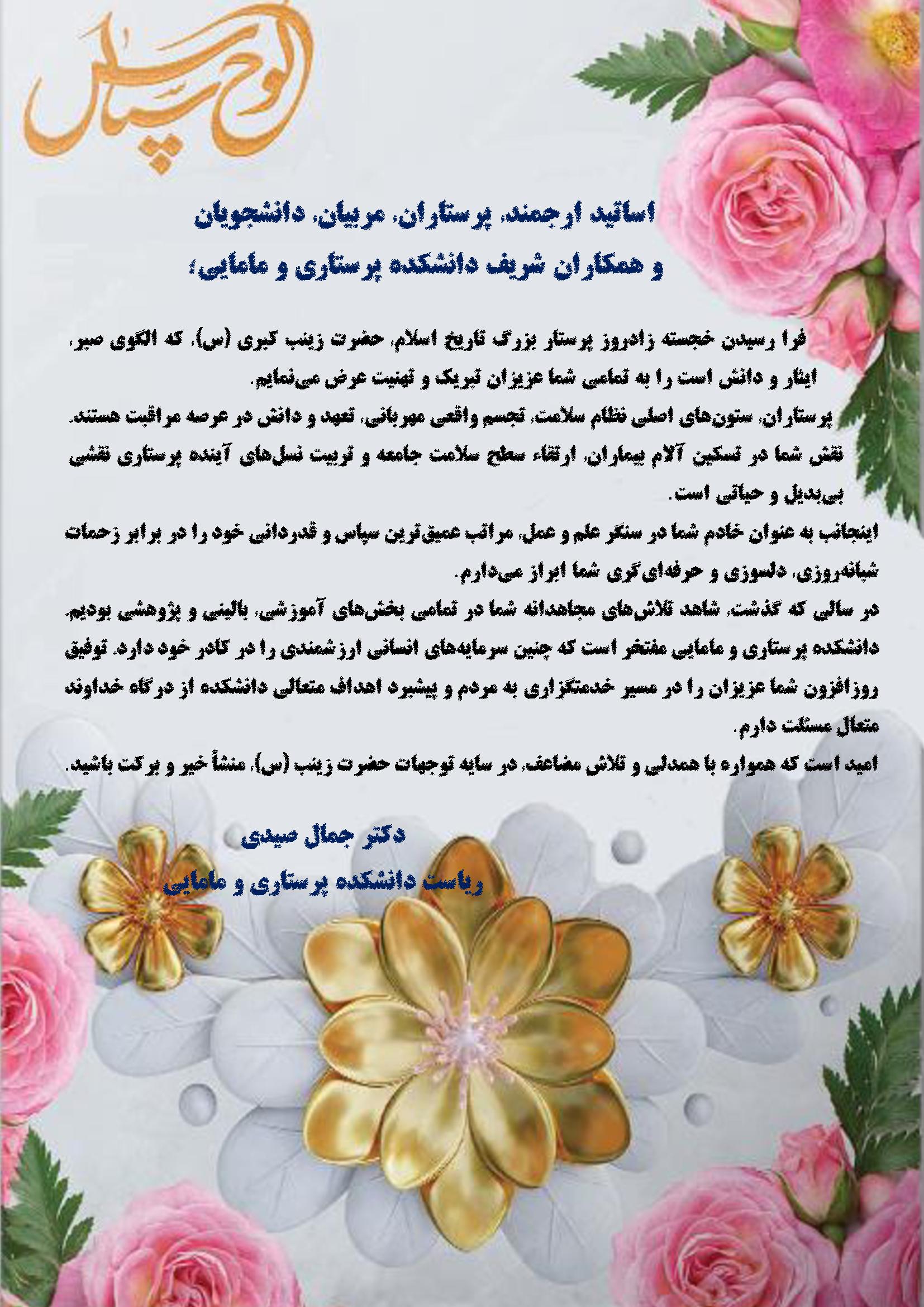 فرا رسیدن خجسته زادروز پرستار بزرگ تاریخ اسلام، حضرت زینب کبری (س)، که الگوی صبر، ایثار و دانش است را به تمامی شما عزیزان تبریک و تهنیت عرض مینمایم.