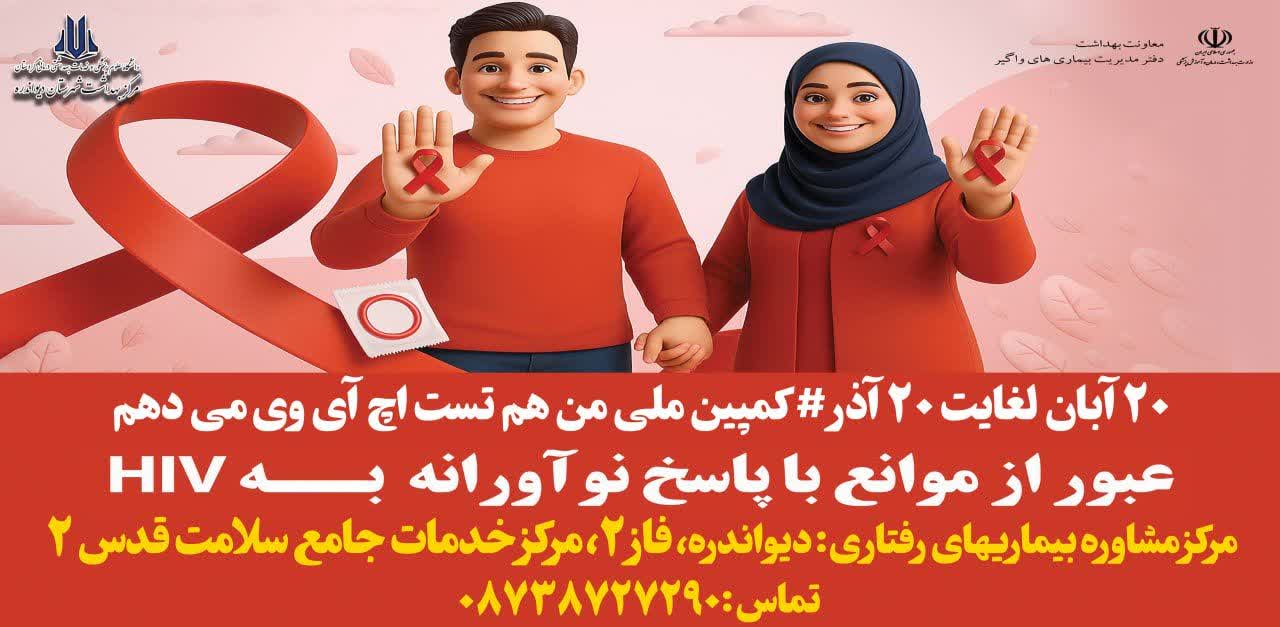 به گزارش روابط عمومی شبکه بهداشت و درمان شهرستان دیواندره، مهندس کرمی رئیس مرکز بهداشت دیواندره در ارتباط با جزئیات پویش ملی اچ آی وی گفت: کمیپن ملی "من هم تست اچ آی وی می دهم" از 20 آبان لغایت 20 آذر سال جاری، با شعار «عبور از موانع با پاسخهای نوآورانه به اچآیوی» و با هدف تشویق گروه های جمعیتی مختلف به انجام تست اچ آی وی، معرفی مراکز مشاوره بیماریهای رفتاری، خدمات تشخیصی و درمانی HIV،فرهنگ سازی و رفع موانع موجود با استفاده از رویکردهای نوین برگزار گردید.