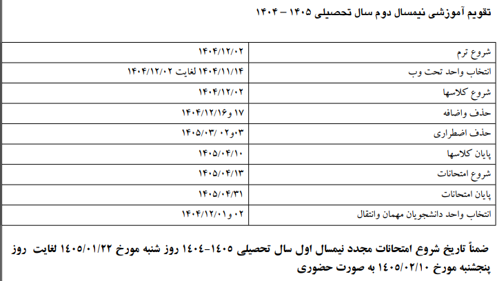 تقویم آموزشی نیمسال دوم سال تحصیلی 1405- 1404