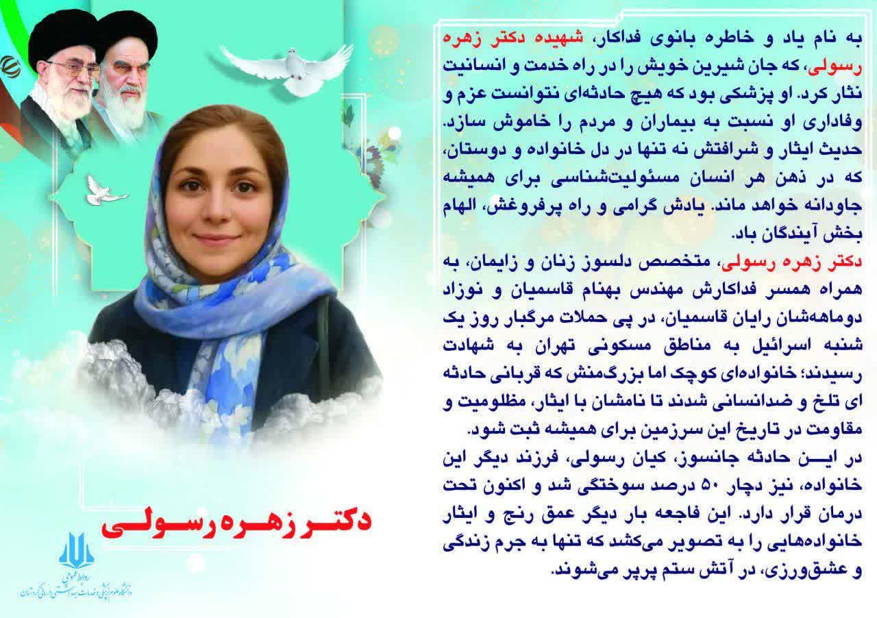 دانشگاه علوم پزشکی کردستان مستند «آغوش ناتمام» را در بزرگداشت زندگی و خدمات شهیده دکتر زهره رسولی در استان تهیه کرد، پزشکی که در جنگ دوازده روزه اخیر شهید شد.
